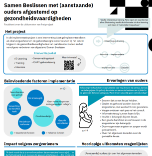 In dit project zijn ontwikkelde producten uit de voorgaande projecten gezamenlijke besluitvorming (2016-2018) en gezondheidsvaardigheden (2022-2024), samen met producten van het Amsterdam UMC, samengevoegd tot een interventiepakket. Dit interventiepakket is geïmplementeerd en geëvalueerd in acht verloskundig samenwerkingsverbanden. Op deze manier hebben we samen met het Amsterdam UMC, alle zorgverleners, (aanstaande) ouders en projectpartners een landelijke impuls gegeven aan gepersonaliseerd Samen Beslissen in de geboortezorg.