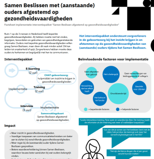 Het interventiepakket bestaat uit een e-learning, on-site training en instrumenten om inzicht te krijgen in en zorg af te stemmen op gezondheidsvaardigheden. De e-learning en on-site training richten zich op gepersonaliseerd Samen Beslissen, wat inhoud dat het proces van gezamenlijke besluitvorming is toegespitst op de gezondheidsvaardigheden van de (aanstaande) ouder(s).